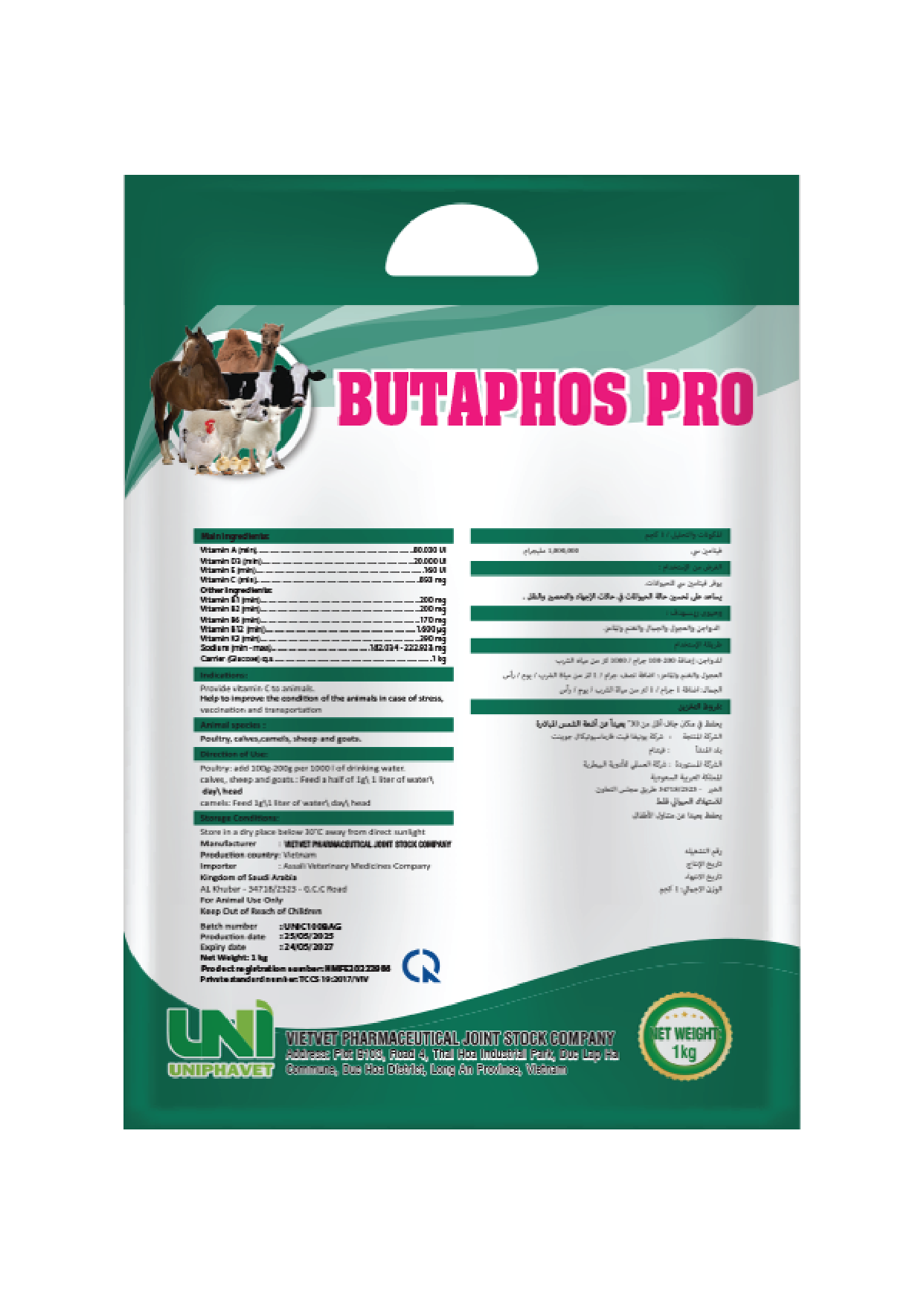L-Lysine HCl, DL-Methionine, Ascorbic acid, Vitamin B3, Vitamin B12, Acid folic, Sorbitol, Butaphosphan, Inositol, distilled water.