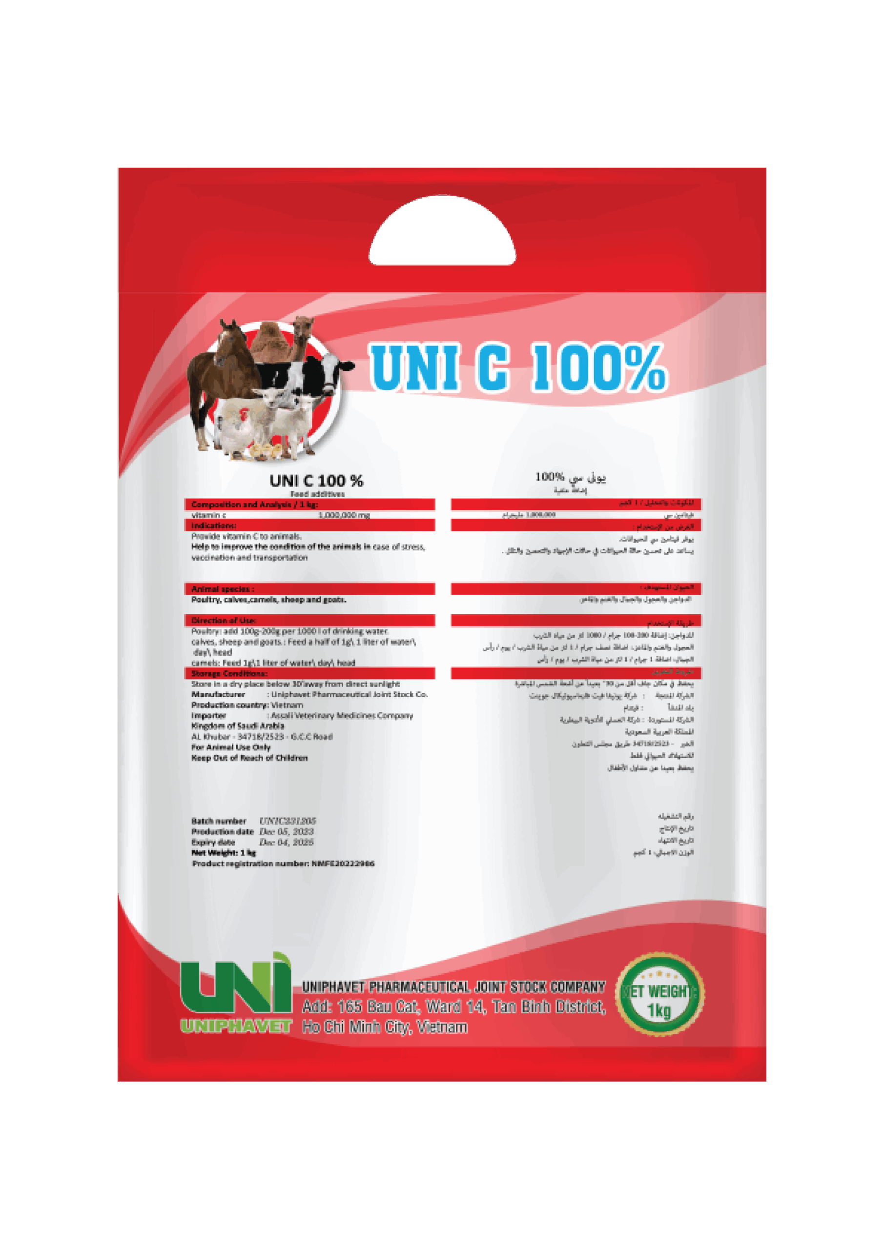 COMPOSITION AND ANALYSIS / 1 KG: Vitamin C: 1,000,000 mg INDICATIONS: Provide vitamin C to animals. Help to improve the condition of the animals in case of stress, vaccination and transportation. ANIMAL SPECIES: Poultry, calves, camels, sheep and goats. DIRECTION OF USE: Poultry: add 100g - 200g per 1000 I...