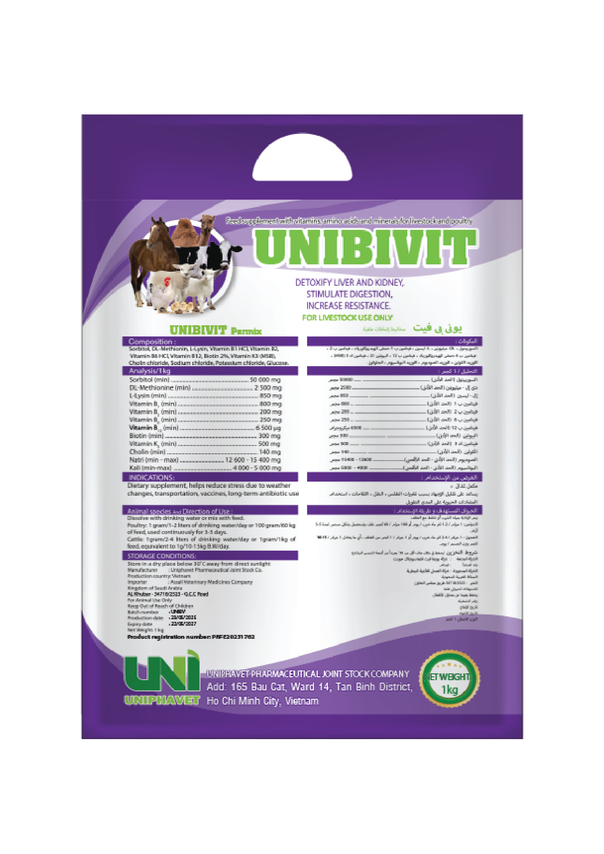 Cattle: 1 gram/ 2 – 4 liters of drinking water/ day or 1 gram/ 1 kg of feed, equivalent to 1 g/ 10 – 15 kg B.W/ day.